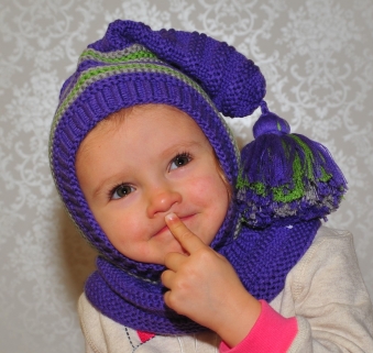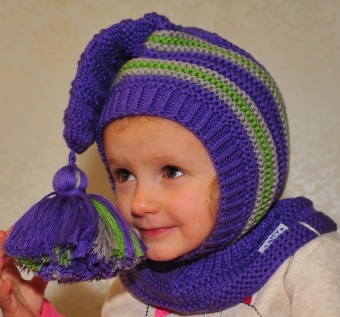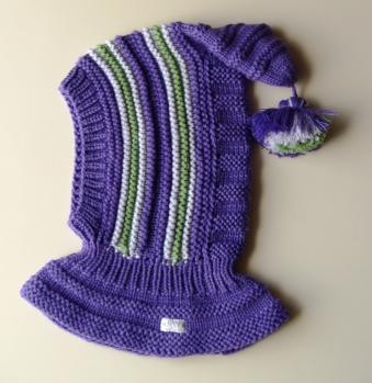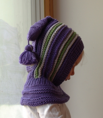 Waldorf inspired winter and snow hat. Hand knitted hoodie / balaclava hat for baby, toddler, child. Made from 100% merino wool in Purple, Green and Silver grey. Soft and very functional - perfect to keep the little ones warm and cozy during cold days.