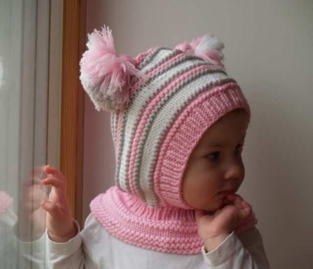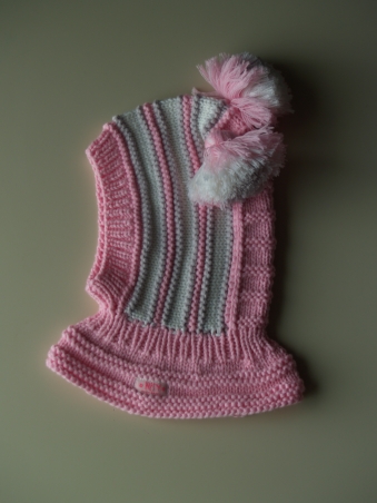 Modelis: Cepurīte ar krāsainām un reljefām svītriņām un diviem zvaniņu bumbuļiem. Darināta bezvīļu adījumā. Iespējams pieskaņot cimdiņus, zeķes, vestīti utt.