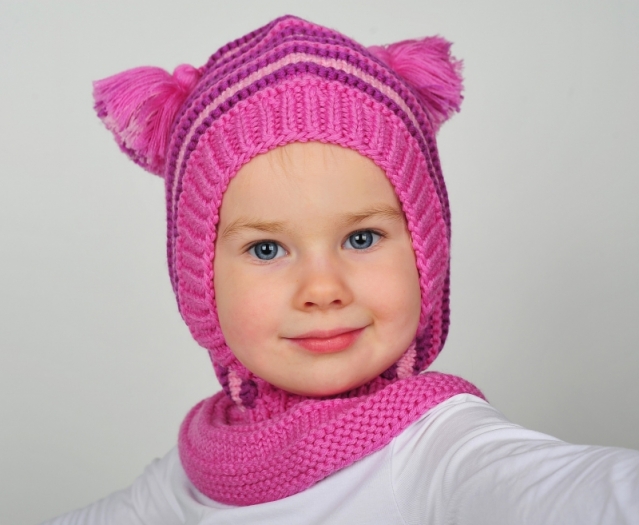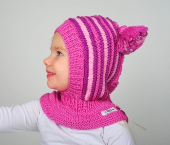Modelis: Cepurīte ar krāsainām un reljefām svītriņām un diviem zvaniņu bumbuļiem. Darināta bezvīļu adījumā. Iespējams pieskaņot cimdiņus, zeķes, vestīti utt.